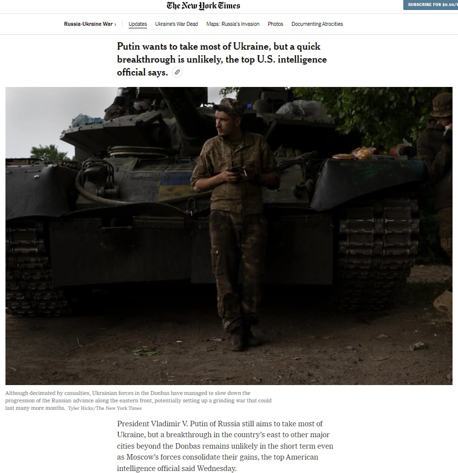 Президент России Владимир Путин по-прежнему стремится захватить большую часть Украины, но прорыв на востоке страны к другим крупным городам за пределами Донбасса остается маловероятным в краткосрочной перспективе, даже если силы Москвы закрепляют свои достижения, заявил в среду высокопоставленный представитель американской разведки. Об этом пишет газета The New York Times.
