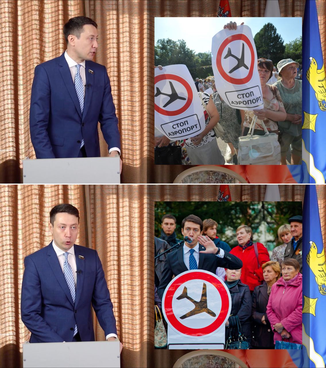Как мы уже писали, там пытались «снести» неутомимого, как и положено быть депутату здорового человека, Николая Кузнецова. В качестве основания — традиционно нарушение законодательства об интеллектуальной собственности: ссылка на карту, плакат с перечёркнутым самолетом «Стоп аэропорту» и, что символично, картинки «депутат» и «избиратель».