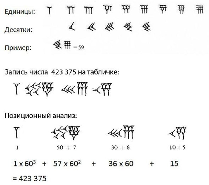 В отличие от нашей позиционной десятичной системы, которая использует девять разных знаков, чтобы отобразить первые девять целых чисел, шестидесятеричная позиционная система вавилонян содержит только два знака – вертикальный клин для единицы и головка клина для десяти. Отображение чисел до 60 происходит по десятичной базе и по старому аддитивному принципу, а для чисел больше 60 используется уже позиционный принцип. Длинное числительное разбивалось на ячейки. Внутрь каждой ячейки можно было вписать число от 1 до 59 по аддитивной системе. При этом значение каждой следующей ячейки умножалось на 60 в возрастающей степени (см. фото). Далее значения ячеек суммировались. Это была крайне сложная система, для исчисления в которой ассириологи в сотрудничестве с математиками разработали несколько он-лайн программ, самая свежая и подробная доступна здесь.