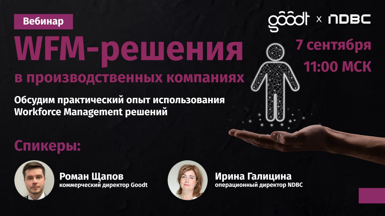 ✅ 7 сентября в 11:00 по МСК эксперты цифровой трансформации @goodt_official и @ndbc_ru проведут вебинар, на котором поделятся реальным опытом и практикой внедрения WFM-решений в производственных компаниях.