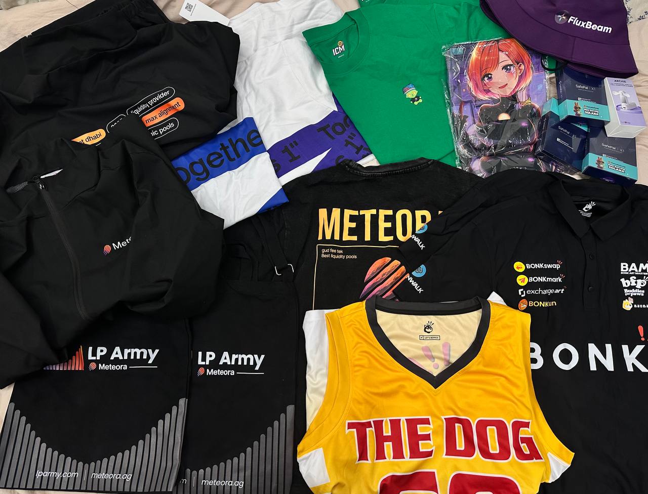 Пройдусь немного по мерчу: качественного мерча на площадках было правда мало. MVP по мерчу забирает без конкуренции Trojan: качественные крутые футболки, плюс коврик для мышки с клавиатурой на весь стол — одно из самых нужных и полезных вещей для криптана. Из добротного мерча могу ещё выделить Solayer: у них была плюшевая пепа прикольная, плюс вентилятор с фонариком. Ну и из необычного могу выделить от самого Breakpoint — MOG-очки, они многим зашли, и некоторые на постоянной основе в них тусовались.