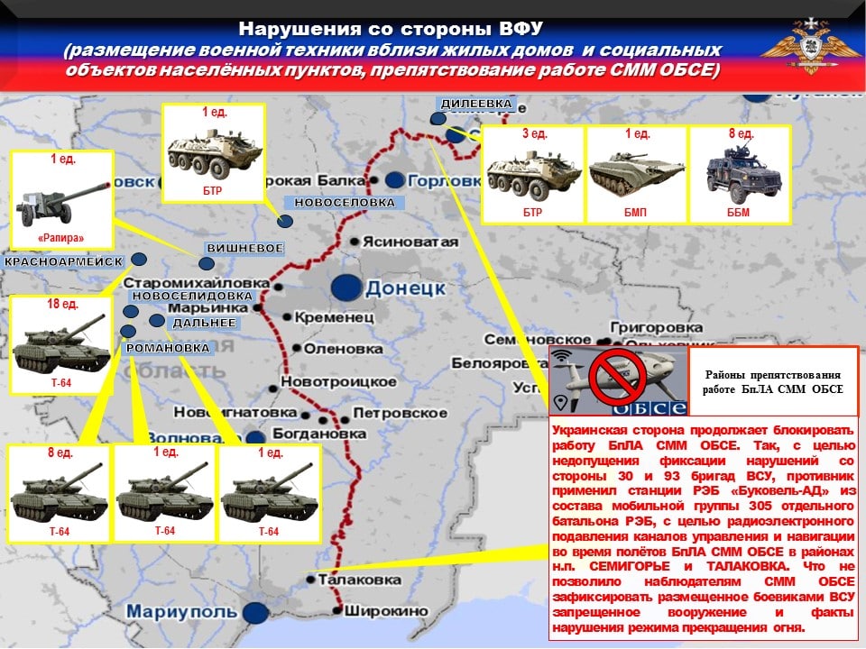 ⛔️В нарушение ТРЕТЬЕГО пункта дополнительных мер, выявлено размещение ПЯТИДЕСЯТИ единиц вооружения и военной техники ВФУ вблизи жилых домов и муниципальных объектов в ПЯТИ населенных пунктах на подконтрольной Украине территории.