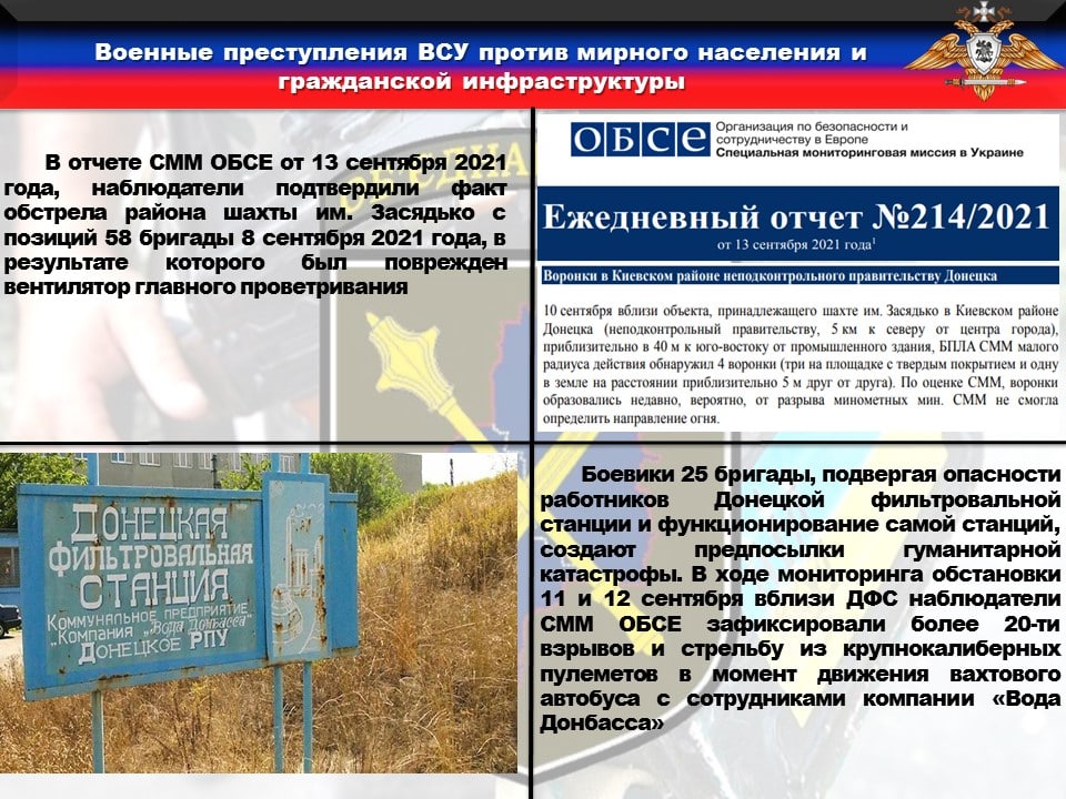 ⚠️Кроме этого, боевики 25 бригады, подвергая опасности работников Донецкой фильтровальной станции и функционирование самой станций, создают предпосылки гуманитарной катастрофы. В ходе мониторинга обстановки 11 и 12 сентября вблизи ДФС наблюдатели СММ ОБСЕ зафиксировали более 20-ти взрывов и стрельбу из крупнокалиберных пулеметов в момент движения вахтового автобуса с сотрудниками компании «Вода Донбасса».