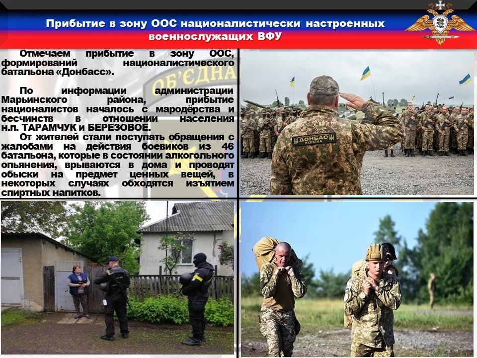 ♦️По информации из администрации Марьинского района, прибытие националистов началось с мародёрства и бесчинств в отношении населения н.п. ТАРАМЧУК и БЕРЕЗОВОЕ. От жителей стали поступать обращения с жалобами на действия боевиков из 46 батальона, которые в состоянии алкогольного опьянения, врываются в дома и проводят обыски на предмет ценных вещей, в некоторых случаях обходятся изъятием спиртных напитков.