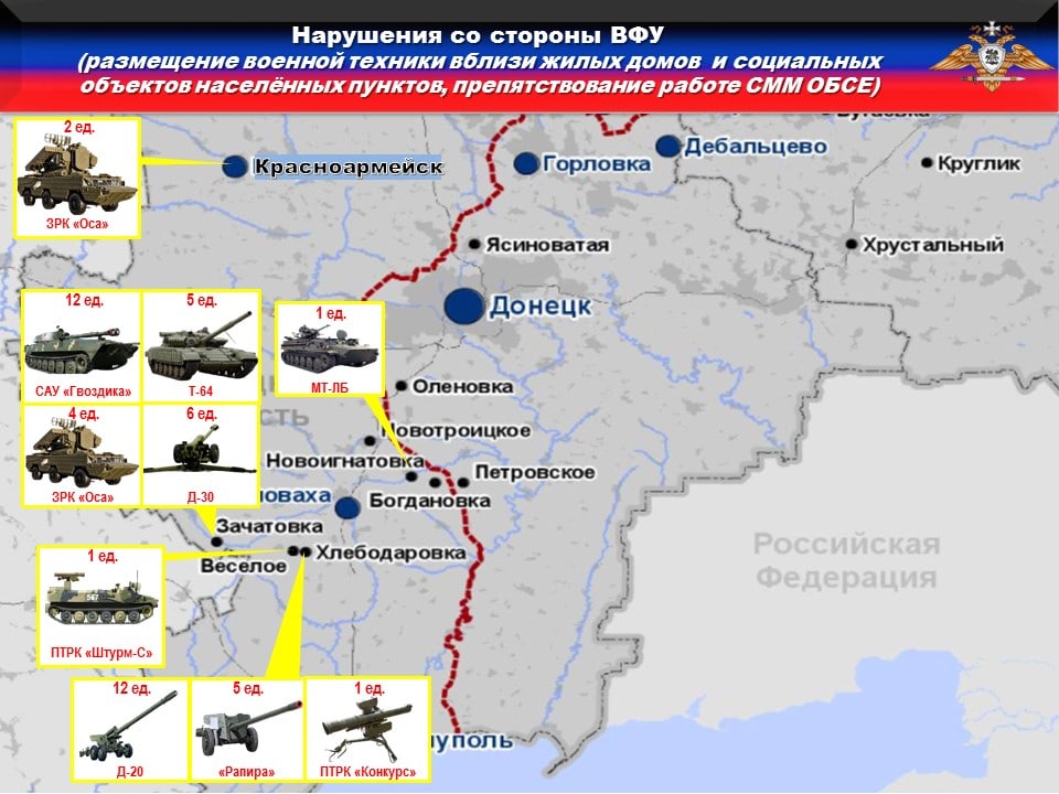 ⛔️В нарушение ТРЕТЬЕГО пункта дополнительных мер, выявлено размещение ПЯТИДЕСЯТИ единиц вооружения и военной техники ВФУ вблизи жилых домов и муниципальных объектов в ПЯТИ населенных пунктах на подконтрольной Украине территории.