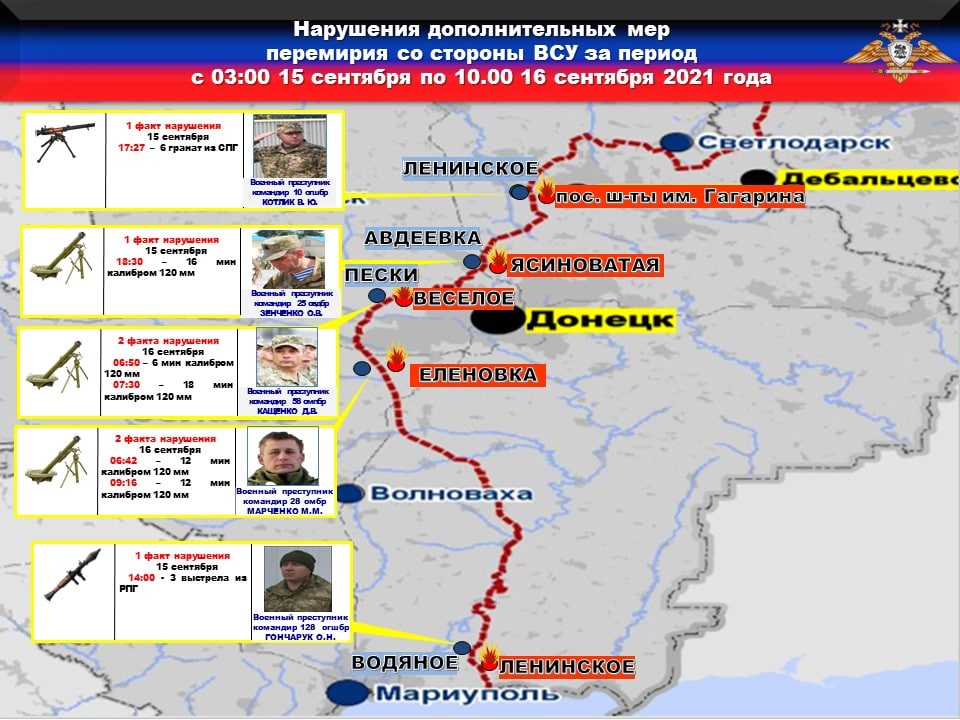 После прибытия в зону ООС украинских боевиков из националистического батальона «Донбасс» обстрелы мирных жителей со стороны ВСУ усилились. Так, утром 15 сентября боевики выпустили по населенному пункту Еленовка 24 мины из запрещенных минскими соглашениями…