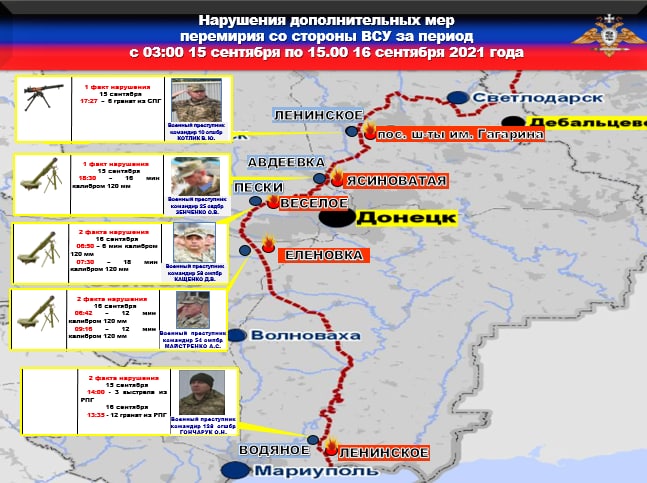 После прибытия в зону ООС украинских боевиков из националистического батальона «Донбасс» обстрелы мирных жителей со стороны ВСУ усилились. Так, утром 15 сентября боевики выпустили по населенному пункту Еленовка 24 мины из запрещенных минскими соглашениями…