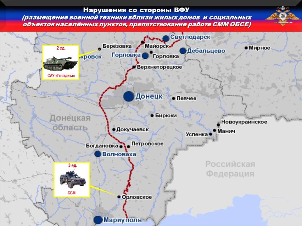 ⛔️В нарушение ТРЕТЬЕГО пункта дополнительных мер, наблюдатели Миссии ОБСЕ подтвердили размещение 119 единиц вооружения и военной техники ВСУ в 17 подконтрольных Украине населенных пунктах вблизи жилых домов и муниципальных объектов.