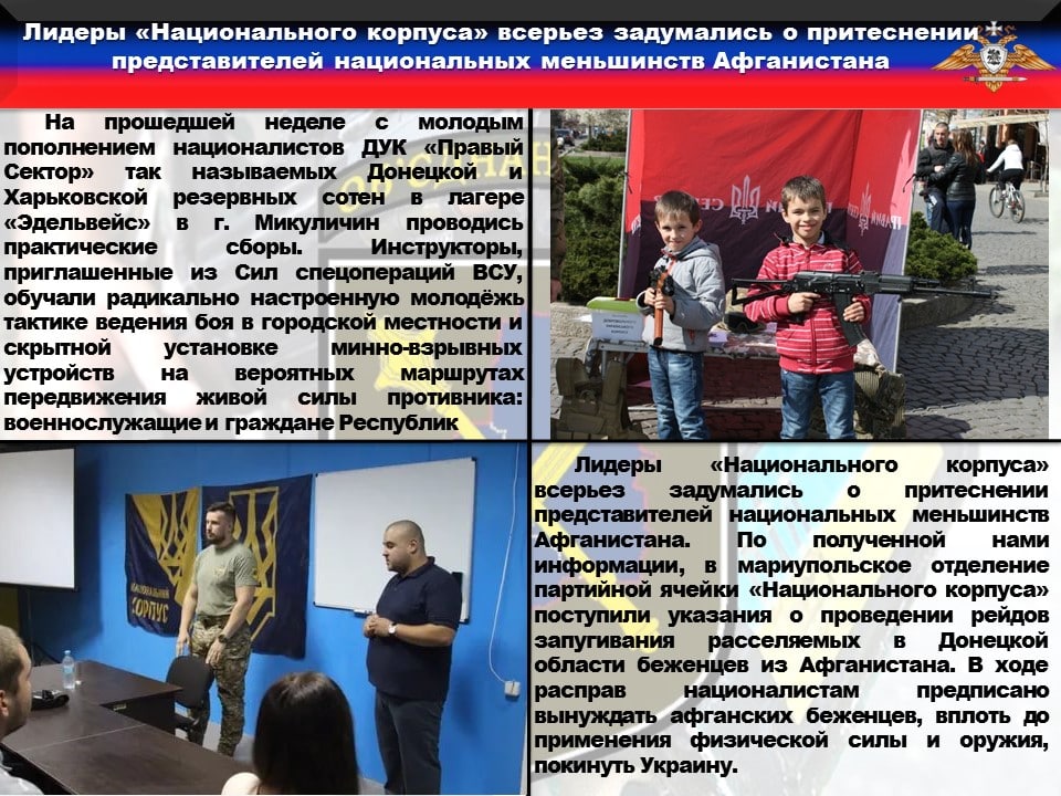 ♦️Кроме этого, лидеры «Национального корпуса» всерьез задумались о притеснении представителей национальных меньшинств Афганистана. По полученной нами информации, в мариупольское отделение партийной ячейки «Национального корпуса» поступили указания о проведении рейдов запугивания расселяемых в Донецкой области беженцев из Афганистана. В ходе расправ националистам предписано вынуждать афганских беженцев, вплоть до применения физической силы и оружия, покинуть Украину.