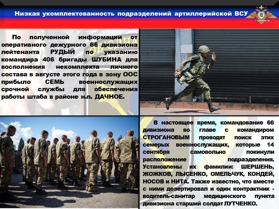 ♦️По полученной информации от оперативного дежурного 66 дивизиона лейтенанта РУДЫЙ по указанию командира 406 бригады ШУБИНА для восполнения некомплекта личного состава в августе этого года в зону ООС прибыло СЕМЬ военнослужащих срочной службы для обеспечения работы штаба в районе н.п. ДАЧНОЕ. В настоящее время, командование 66 дивизиона во главе с командиром СТРОГАНОВЫМ проводят поиск этих семерых срочников, которые 14 сентября самовольно покинули расположение подразделения. Установлены их фамилии: ШЕРШЕНЬ, ЖОЖКОВ, ЛЫСЕНКО, ОМЕЛЬЧУК, КОНДЕЙ, НОСОВ и НИТА. Также известно, что вместе с ними дезертировал и один контрактник - водитель-санитар медицинского пункта дивизиона старший солдат ЛУТЧЕНКО.