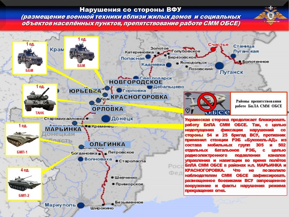 ⛔️Украинская сторона продолжает блокировать работу БпЛА СММ ОБСЕ. Так, с целью недопущения фиксации нарушений со стороны 54 и 25 бригад ВСУ, противник применил станции РЭБ «Буковель-АД» из состава мобильных групп 305 и 502 отдельных батальонов РЭБ, с целью радиоэлектронного подавления каналов управления и навигации во время полётов БпЛА СММ ОБСЕ в районах н.п. МАРЬИНКА и КРАСНОГОРОВКА. Что не позволило наблюдателям СММ ОБСЕ зафиксировать размещенное боевиками ВСУ запрещенное вооружение и факты нарушения режима прекращения огня.