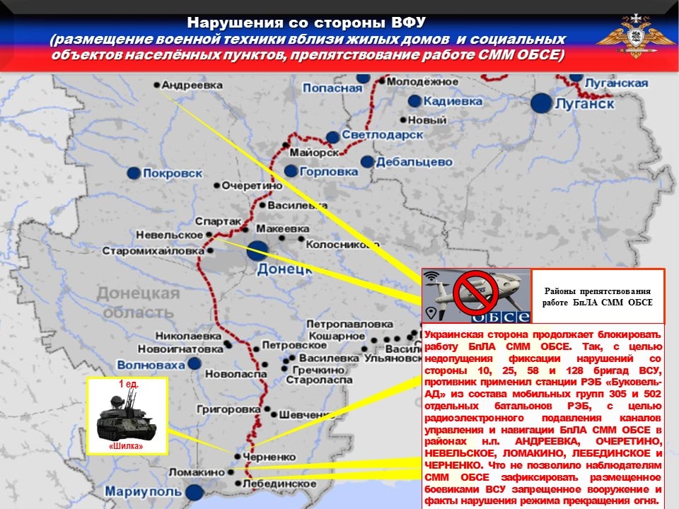 ⚠️Украинская сторона продолжает блокировать работу БпЛА СММ ОБСЕ с целью недопущения фиксации размещения запрещенного Минскими соглашениями вооружения. Так, в зонах ответственности 10, 25, 58 и 128 бригад противник применил станции РЭБ «Буковель-АД» из состава мобильных групп 305 и 502 отдельных батальонов РЭБ, с целью радиоэлектронного подавления каналов управления и навигации БпЛА СММ ОБСЕ в районах н.п. АНДРЕЕВКА, ОЧЕРЕТИНО, НЕВЕЛЬСКОЕ, ЛОМАКИНО и ЛЕБЕДИНСКОЕ.