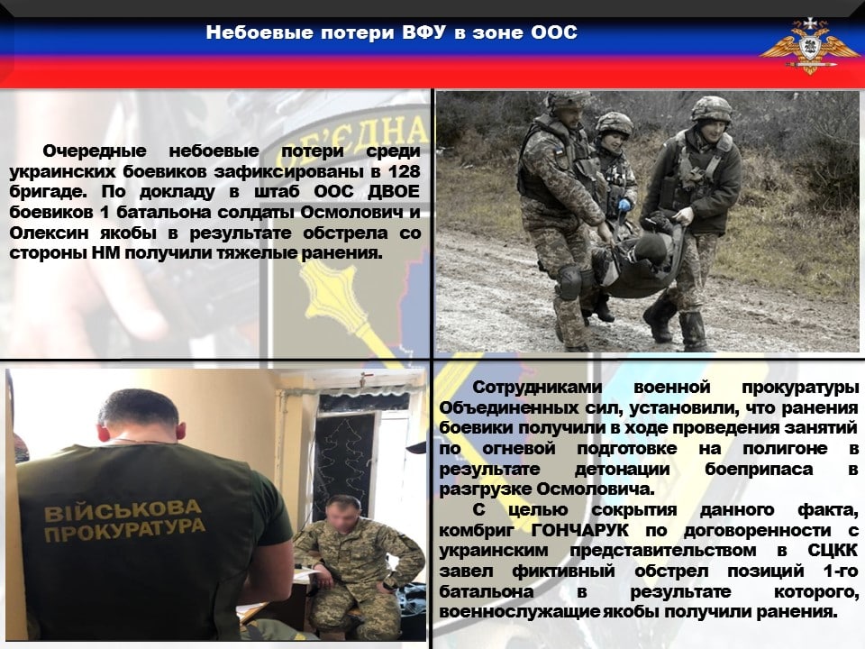 ♦️Очередные небоевые потери среди украинских боевиков зафиксированы в 128 бригаде. По докладу в штаб ООС ДВОЕ боевиков 1 батальона солдаты Осмолович и Олексин якобы в результате обстрела со стороны НМ получили тяжелые ранения. Однако сотрудники военной прокуратуры Объединенных сил, прибывшие в подразделение для уточнения обстоятельств происшествия обладают другой информацией. По их данным ранения боевики получили в ходе проведения занятий по огневой подготовке на полигоне в результате детонации боеприпаса в разгрузке Осмоловича. С целью сокрытия данного факта, комбриг ГОНЧАРУК по договоренности с украинским представительством в СЦКК завел фиктивный обстрел позиций 1-го батальона в результате которого, военнослужащие якобы получили ранения.