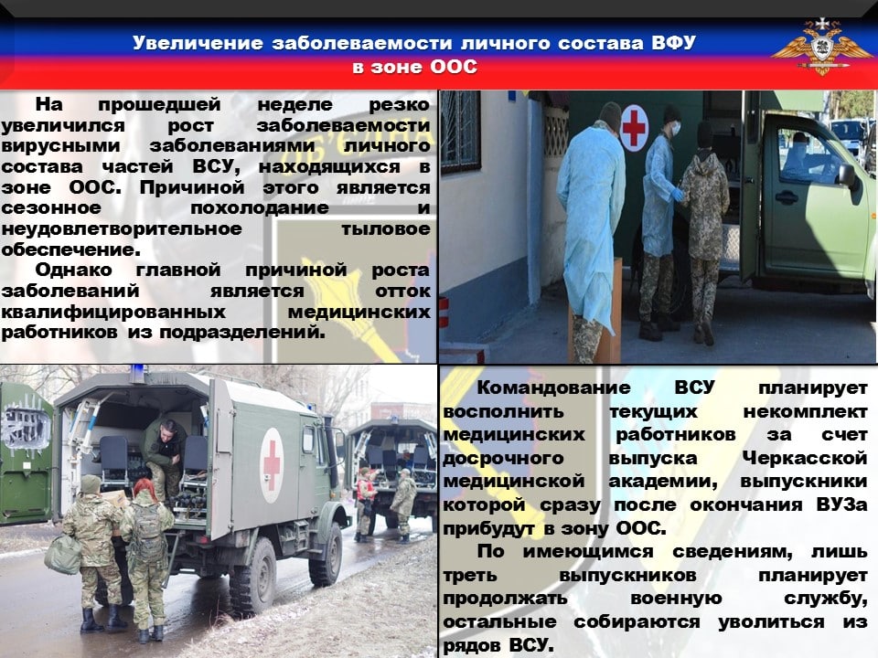 🦇Прошедшая неделя была охарактеризована резким увеличением заболеваемости вирусными заболеваниями личного состава частей ВСУ, находящихся в зоне ООС. Причиной этого является сезонное похолодание и неудовлетворительное тыловое обеспечение.
