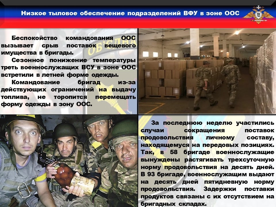 🦇Огромное беспокойство командования ООС вызывает срыв поставок вещевого имущества в бригады. Сезонное понижение температуры треть военнослужащих ВСУ в зоне ООС встретили в летней форме одежды. В то время, как вещевые склады бригад в ППД забиты зимним обмундированием, командование не торопится перемещать их в зону ООС по причине действующих ограничений на выдачу топлива.