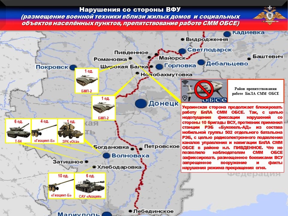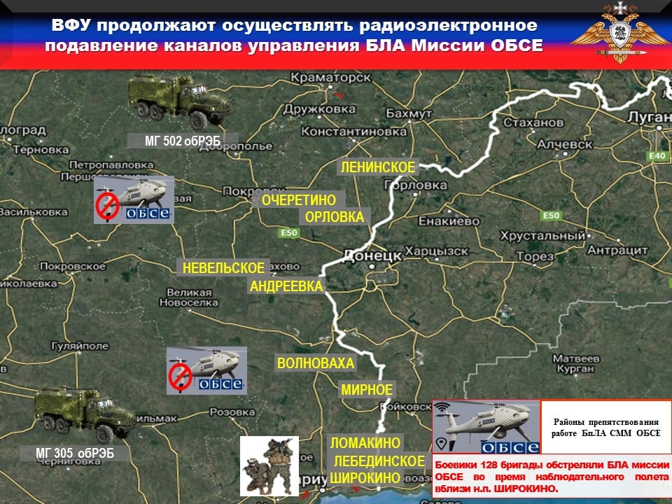 ⚠️Украинская сторона продолжает блокировать работу БпЛА СММ ОБСЕ. Так, с целью недопущения фиксации нарушений со стороны 10 и 128 бригад, противник применял станции РЭБ «Буковель-АД» из состава мобильных групп 305 и 502 отдельных батальонов РЭБ, для радиоэлектронного подавления каналов управления и навигации БпЛА СММ ОБСЕ в районах н.п. АНДРЕЕВКА, ДЗЕРЖИНСК, НОВГОРОДСКОЕ и ОРЛОВСКОЕ.
