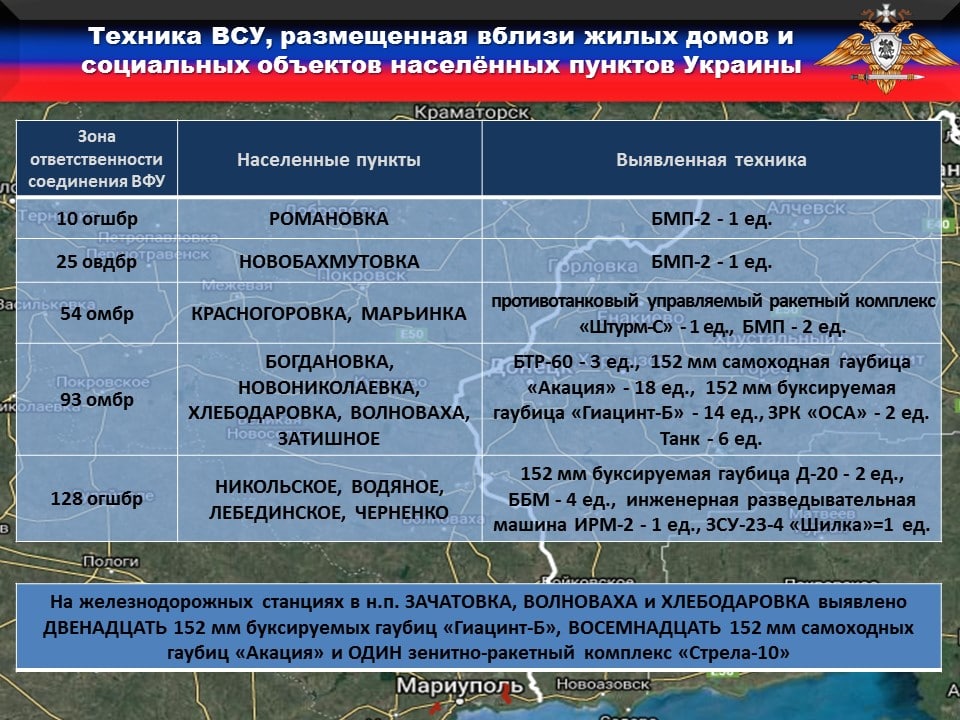🔻Кроме того, зафиксировано нахождение ДВЕНАДЦАТИ 152 мм буксируемых гаубиц «Гиацинт-Б», ВОСЕМНАДЦАТИ 152 мм самоходных гаубиц «Акация» и ОДНОГО зенитно-ракетного комплекса «Стрела-10» на железнодорожных станциях в н.п. ЗАЧАТОВКА, ВОЛНОВАХА и ХЛЕБОДАРОВКА.