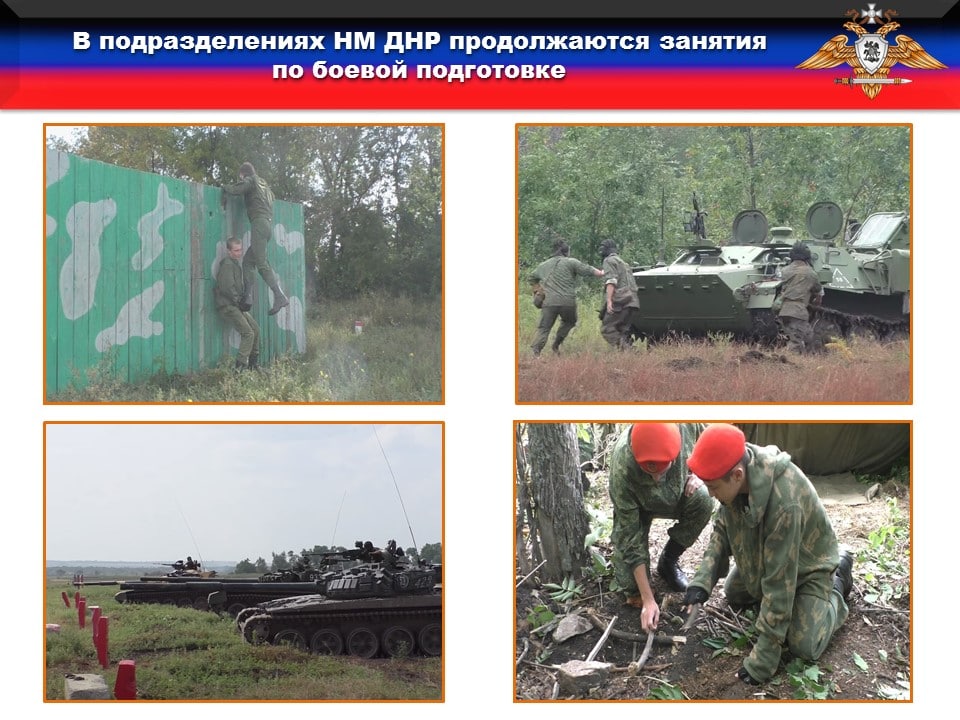 🔹В подразделениях Народной милиции продолжаются занятия по боевой подготовке. На минувшей неделе основное внимание было уделено совместной подготовке мотострелковых и танковых подразделений оборонного ведомства. Все задействованные подразделения показали высокий уровень профессиональной подготовки, на «отлично» выполнив поставленные командованием перед ними учебные задачи.