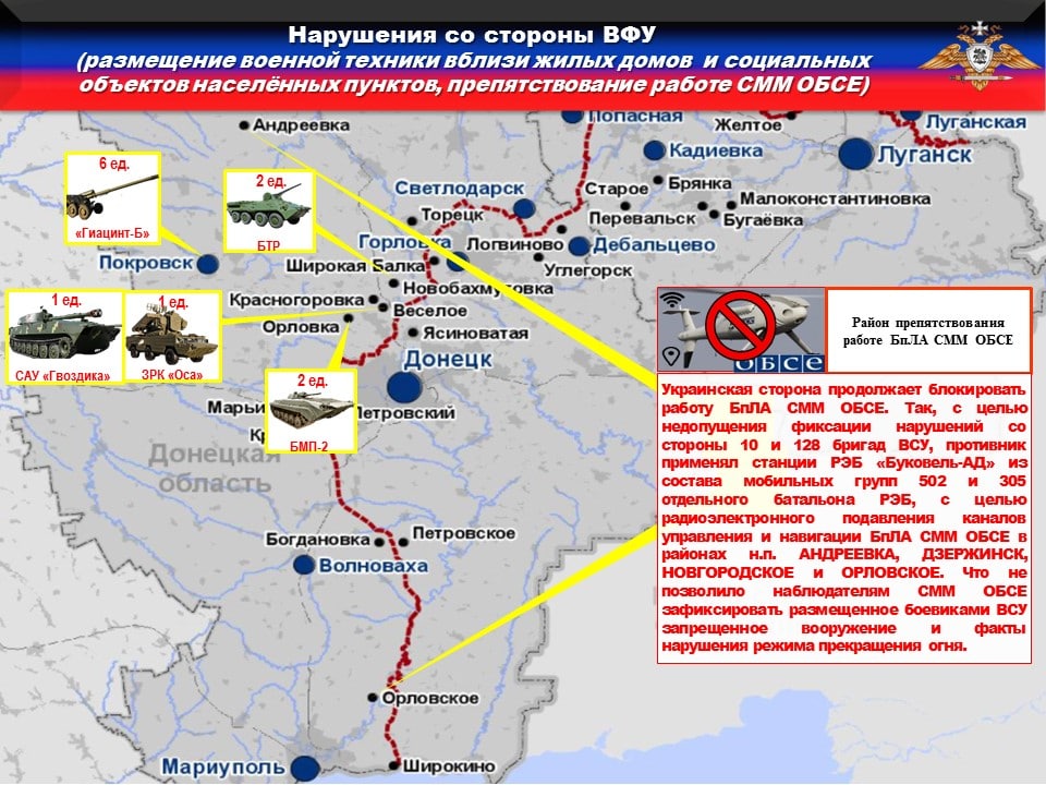 ⚠️Украинская сторона продолжает блокировать работу БпЛА СММ ОБСЕ. Так, с целью недопущения фиксации нарушений со стороны 10 и 128 бригад, противник применял станции РЭБ «Буковель-АД» из состава мобильных групп 305 и 502 отдельных батальонов РЭБ, для радиоэлектронного подавления каналов управления и навигации БпЛА СММ ОБСЕ в районах н.п. АНДРЕЕВКА, ДЗЕРЖИНСК, НОВГОРОДСКОЕ и ОРЛОВСКОЕ.