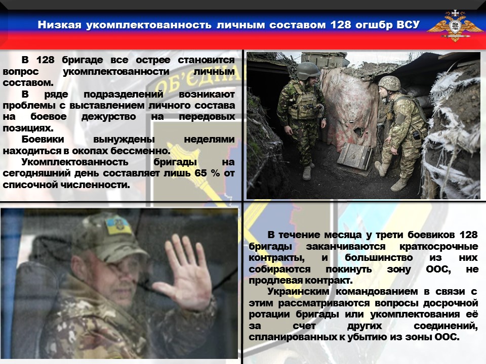 🔹По имеющимся у нас данным в 128 бригаде все острее становится вопрос укомплектованности личным составом. В ряде подразделений в связи с этим возникают проблемы с выставлением личного состава на боевое дежурство на передовых позициях. Боевики вынуждены неделями находиться в окопах бессменно.