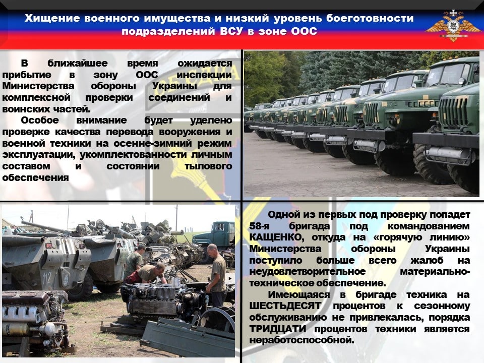 🔹В ближайшее время ожидается прибытие в зону ООС инспекции Министерства обороны Украины для комплексной проверки соединений и воинских частей. Особое внимание будет уделено проверке качества перевода вооружения и военной техники на осенне-зимний режим эксплуатации, укомплектованности личным составом и состоянию тылового обеспечения.