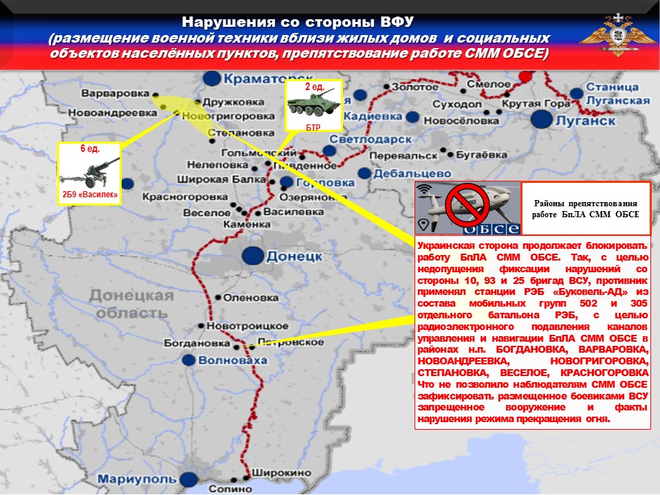 ⚠️Украинская сторона продолжает блокировать работу БпЛА СММ ОБСЕ. Так, с целью недопущения фиксации нарушений со стороны 10, 93 и 25 бригад, противник применял станции РЭБ «Буковель-АД» из состава мобильных групп 305 и 502 отдельных батальонов РЭБ, для радиоэлектронного подавления каналов управления и навигации БпЛА СММ ОБСЕ в районах н.п. БОГДАНОВКА, ВАРВАРОВКА, НОВОАНДРЕЕВКА, НОВОГРИГОРОВКА, СТЕПАНОВКА, ВЕСЕЛОЕ, КРАСНОГОРОВКА.