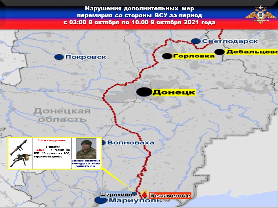 11 октября в преддверии предстоящих переговоров рабочих подгрупп Минской Контактной группы, боевики 128 бригады по приказу военного преступника ГОНЧАРУКА вели огонь из РПГ и СПГ в направлении н.п. КОМИНТЕРНОВО, выпустив ЧЕТЫРЕ гранаты.