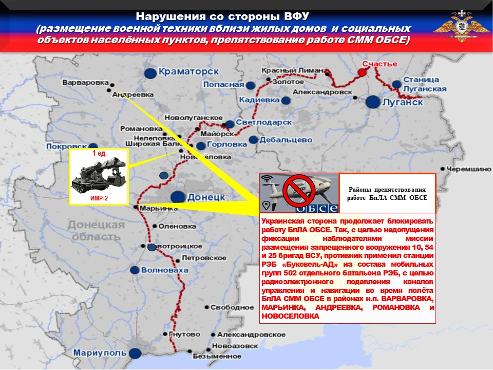 ⚠️Украинская сторона продолжает блокировать работу БпЛА ОБСЕ. Так, с целью недопущения фиксации наблюдателями миссии размещения запрещенного вооружения 10 и 25 бригад, противник применил станции РЭБ «Буковель-АД» из состава мобильной группы 502 отдельного батальона РЭБ, для радиоэлектронного подавления каналов управления и навигации во время полёта БпЛА СММ ОБСЕ в районах н.п. ВАРВАРОВКА, МИРОЛЮБОВКА, НОВОАНДРЕЕВКА, АНДРЕЕВКА и КУРДЮМОВКА.