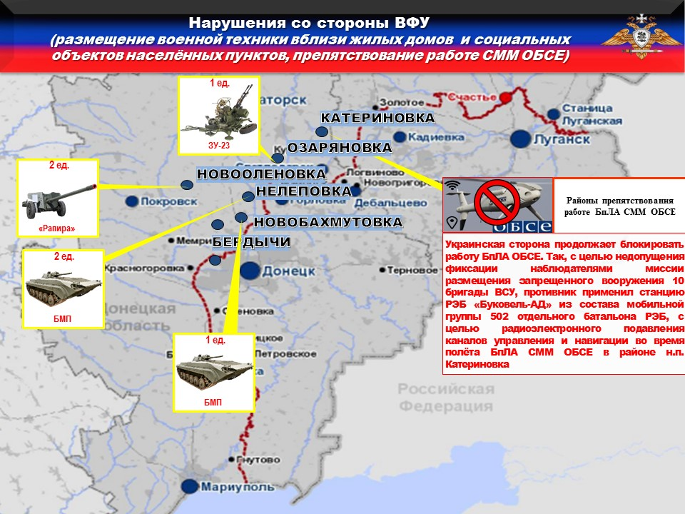 ⛔️Украинское командование продолжает нарушать мандат. С целью недопущения фиксации БПЛА СММ ОБСЕ нарушений со стороны 10 бригады ВСУ, противник применил станции РЭБ «Буковель-АД» из состава мобильных групп 502 отдельного батальона РЭБ, с целью радиоэлектронного подавления каналов управления и навигации во время полётов БпЛА Миссии в районе н.п. КАТЕРИНОВКА.