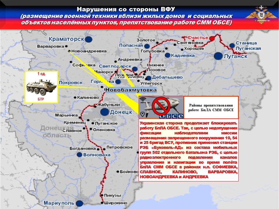 ⛔️Украинское командование продолжает нарушать мандат СММ ОБСЕ. Так, с целью недопущения фиксации БПЛА Миссии нарушений со стороны 10 и 128 бригад ВСУ, противник применял станции РЭБ «Буковель-АД» из состава мобильных групп 502 и 305 отдельных батальонов РЭБ, с целью радиоэлектронного подавления каналов управления и навигации во время полётов БпЛА СММ ОБСЕ в районах н.п. РОГАНСКОЕ, КОНСТАНТИНОВКА, ВАРВАРОВКА, ОРЛОВСКОЕ, ВОЗДВИЖЕНКА, ВЕРШИНА И МИРОНОВКА.