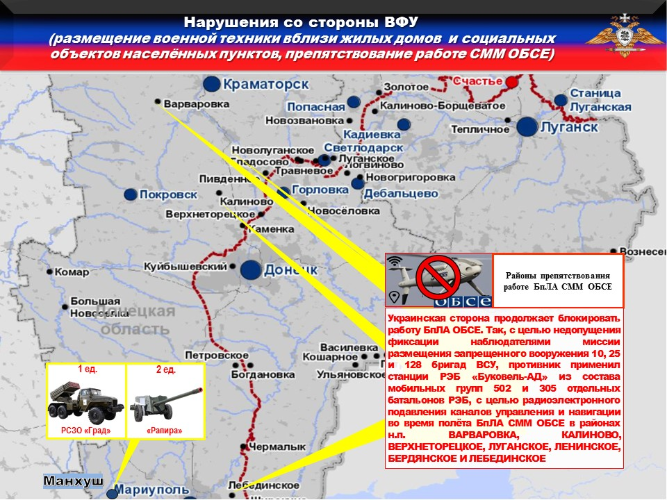 ❗️Украинское командование продолжает нарушать мандат СММ ОБСЕ. Так, с целью недопущения фиксации БПЛА Миссии нарушений со стороны 10, 25 и 128 бригад ВСУ, противник применял станции РЭБ «Буковель-АД» из состава мобильных групп 502 и 305 отдельных батальонов РЭБ, с целью радиоэлектронного подавления каналов управления и навигации во время полётов БпЛА СММ ОБСЕ в районах н.п. ВАРВАРОВКА, КАЛИНОВО, ВЕРХНЕТОРЕЦКОЕ, ЛУГАНСКОЕ, ЛЕНИНСКОЕ, БЕРДЯНСКОЕ И ЛЕБЕДИНСКОЕ.