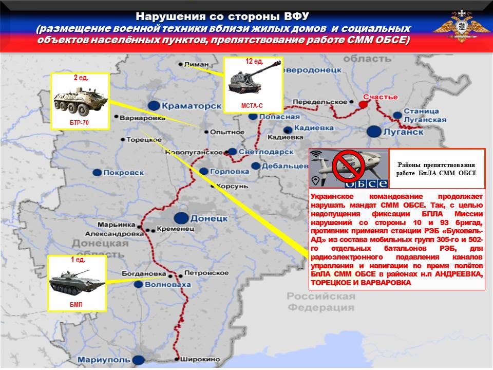 ♦️Украинское командование продолжает нарушать мандат СММ ОБСЕ. Так, с целью недопущения фиксации БПЛА Миссии нарушений со стороны 10 и 93 бригад, противник применял станции РЭБ «Буковель-АД» из состава мобильных групп 305-го и 502-го отдельных батальонов РЭБ, для радиоэлектронного подавления каналов управления и навигации во время полётов БпЛА СММ ОБСЕ в районах н.п АНДРЕЕВКА, ТОРЕЦКОЕ И ВАРВАРОВКА.