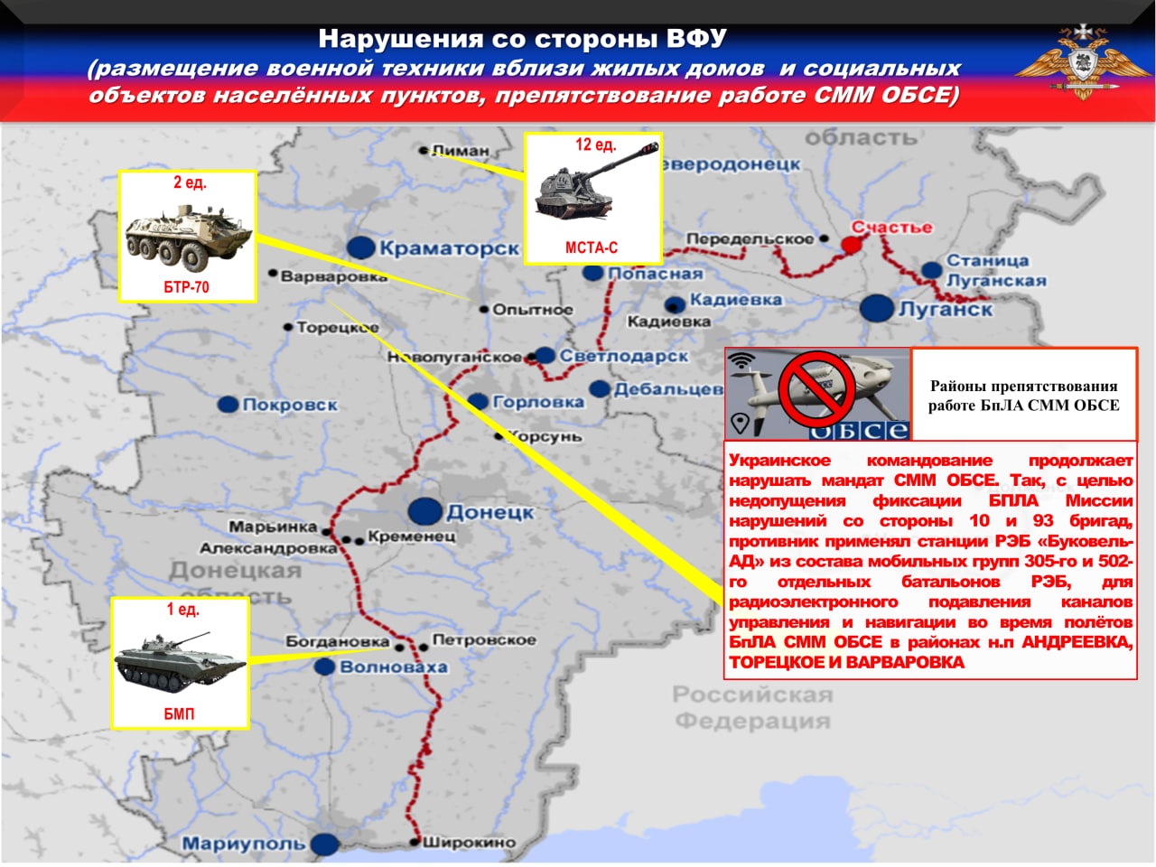 ♦️Украинское командование продолжает нарушать мандат СММ ОБСЕ. Так, с целью недопущения фиксации БПЛА Миссии нарушений со стороны 10 и 93 бригад, противник применял станции РЭБ «Буковель-АД» из состава мобильных групп 305-го и 502-го отдельных батальонов РЭБ, для радиоэлектронного подавления каналов управления и навигации во время полётов БпЛА СММ ОБСЕ в районах н.п АНДРЕЕВКА, ТОРЕЦКОЕ И ВАРВАРОВКА.