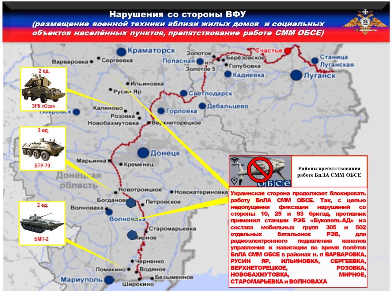 🚫Украинская сторона продолжает блокировать работу БпЛА СММ ОБСЕ. Так, с целью недопущения фиксации нарушений со стороны 10, 25 и 93 бригад, противник применил станции РЭБ «Буковель-АД» из состава мобильных групп 305 и 502 отдельных батальонов РЭБ, для радиоэлектронного подавления каналов управления и навигации во время полётов БпЛА СММ ОБСЕ в районах н.п. ВАРВАРОВКА, РУСИН ЯР, ИЛЬИНОВКА, СЕРГЕЕВКА, ВЕРХНЕТОРЕЦКОЕ, РОЗОВКА, НОВОБАХМУТОВКА, МИРНОЕ, СТАРОМАРЬЕВКА и ВОЛНОВАХА.