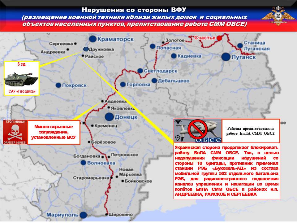 Украинская сторона продолжает блокировать работу БпЛА СММ ОБСЕ. Так, с целью недопущения фиксации нарушений со стороны 10 и 128 бригад, противник применил станции РЭБ «Буковель-АД» из состава мобильных групп 502 и 305 отдельных батальонов РЭБ, для радиоэлектронного подавления каналов управления и навигации БпЛА СММ ОБСЕ в районах н.п. НЕЛЕПОВКА, НОВГОРОДСКОЕ, ВЕРХНЕТОРЕЦКОЕ, ОРЛОВСКОЕ, ЧЕРНЕНКО и ПАВЛОПОЛЬ.