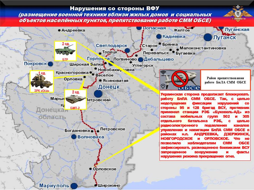 ❗️Украинская сторона продолжает блокировать работу БпЛА СММ ОБСЕ. Так, с целью недопущения фиксации нарушений со стороны 95 и 128 бригад, противник применял станции РЭБ «Буковель-АД» из состава мобильных групп 305 и 502 отдельных батальонов РЭБ, для радиоэлектронного подавления каналов управления и навигации БпЛА СММ ОБСЕ в районах н.п. АНДРЕЕВКА, ДЗЕРЖИНСК, НОВГОРОДСКОЕ и ОРЛОВСКОЕ.