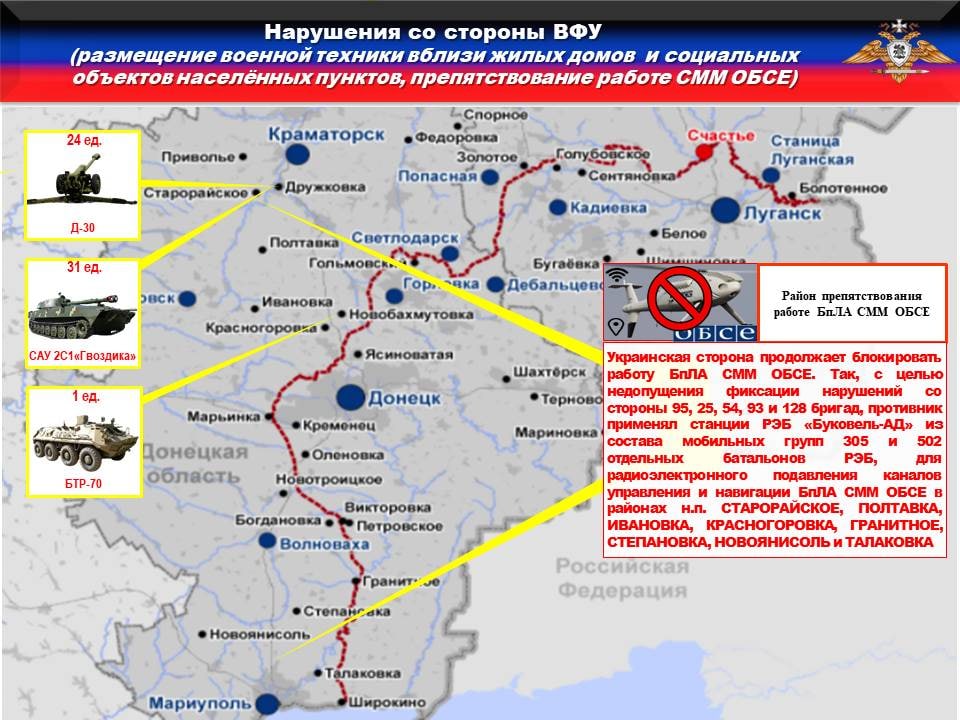 🚫Украинская сторона продолжает блокировать работу БпЛА СММ ОБСЕ. Так, с целью недопущения фиксации нарушений со стороны 25 и 93 бригад, противник применял станции РЭБ «Буковель-АД» из состава мобильных групп 305 и 502 отдельных батальонов РЭБ, для радиоэлектронного подавления каналов управления и навигации БпЛА СММ ОБСЕ в районах н.п. АНДРЕЕВКА, ВАРВАРОВКА, НИКОЛАЙПОЛЬЕ и НОВОСЁЛОВКА.