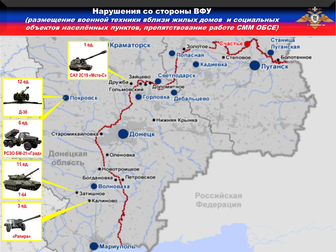 🚫В нарушение ТРЕТЬЕГО пункта дополнительных мер, украинские вооруженные формирования разместили ПЯТНАДЦАТЬ единиц вооружения и военной техники вблизи жилых домов и муниципальных объектов на подконтрольной Украине территории: