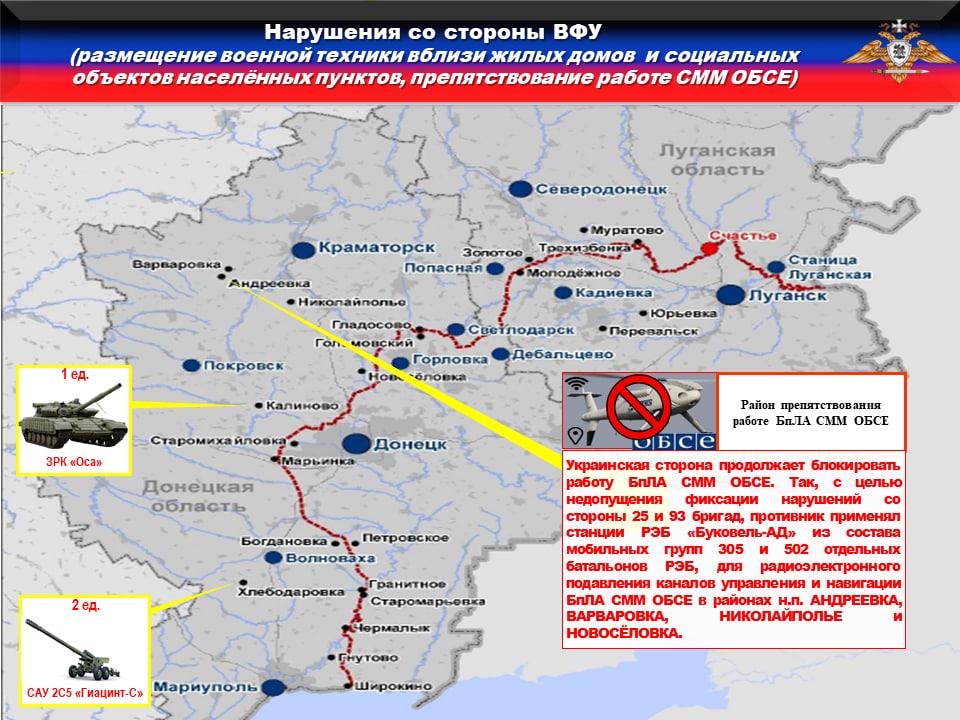 🚫Украинская сторона продолжает блокировать работу БпЛА СММ ОБСЕ. Так, с целью недопущения фиксации нарушений со стороны 25 и 93 бригад, противник применял станции РЭБ «Буковель-АД» из состава мобильных групп 305 и 502 отдельных батальонов РЭБ, для радиоэлектронного подавления каналов управления и навигации БпЛА СММ ОБСЕ в районах н.п. АНДРЕЕВКА, ВАРВАРОВКА, НИКОЛАЙПОЛЬЕ и НОВОСЁЛОВКА.