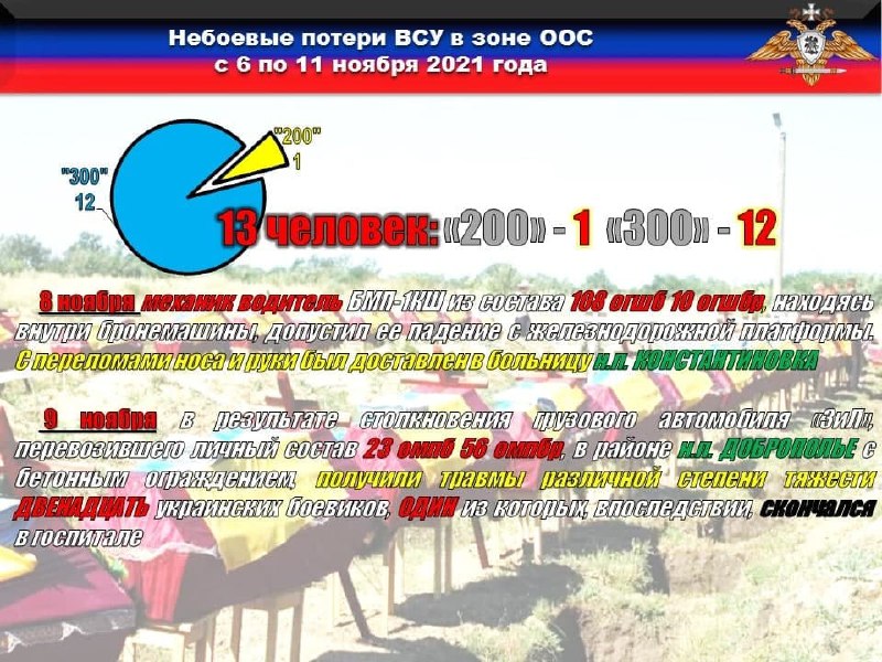 🔻В период с 6 по 11 ноября в зоне ответственности ОТГ «Восток» небоевые потери составили ТРИНАДЦАТЬ человек, ОДИН из которых погиб: