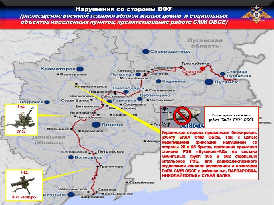 ⛔️Украинская сторона продолжает блокировать работу БпЛА ОБСЕ. Так, с целью недопущения фиксации наблюдателями миссии размещения запрещенного вооружения 54, 95 и 128 бригад, для радиоэлектронного подавления каналов управления и навигации во время полётов БпЛА СММ ОБСЕ в районах н.п. НОВОАНДРЕЕВКА, ГАЛИЦИНОВКА, ПРИВОЛЬЕ, НОВГОРОДСКОЕ, РАЙСКОЕ, СТЕПНОЕ, КРАСНОГОРОВКА, ПИЩЕВИК, ГНУТОВО и ВОДЯНОЕ противник применил станции РЭБ «Буковель-АД» из состава мобильных групп 502 и 305 отдельных батальонов РЭБ.