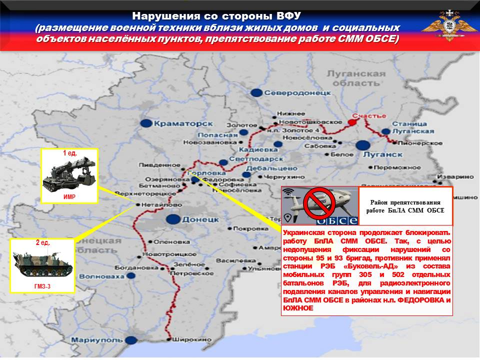 ⛔️Украинская сторона продолжает блокировать работу БпЛА ОБСЕ. Так, с целью недопущения фиксации наблюдателями миссии размещения запрещенного вооружения 54, 95 и 128 бригад, для радиоэлектронного подавления каналов управления и навигации во время полётов БпЛА СММ ОБСЕ в районах н.п. НОВОАНДРЕЕВКА, ГАЛИЦИНОВКА, ПРИВОЛЬЕ, НОВГОРОДСКОЕ, РАЙСКОЕ, СТЕПНОЕ, КРАСНОГОРОВКА, ПИЩЕВИК, ГНУТОВО и ВОДЯНОЕ противник применил станции РЭБ «Буковель-АД» из состава мобильных групп 502 и 305 отдельных батальонов РЭБ.