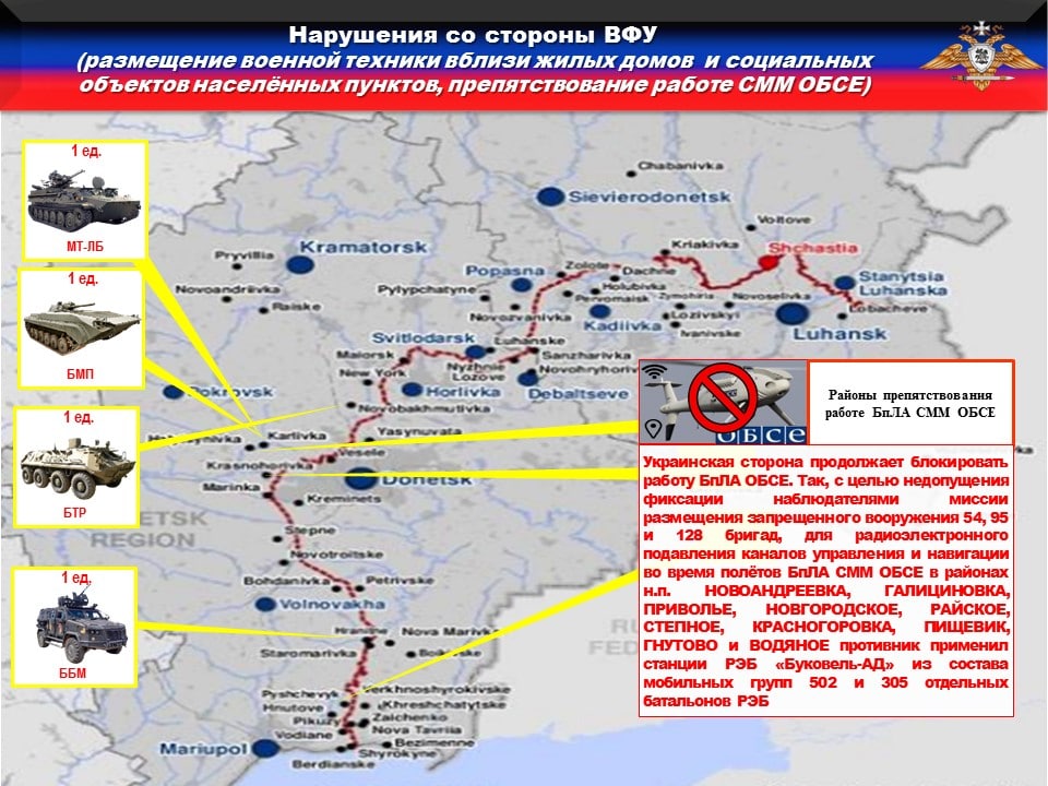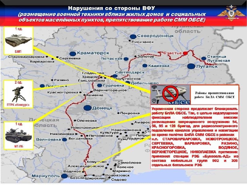 ⚠️Украинская сторона продолжает блокировать работу БпЛА ОБСЕ. Так, с целью недопущения фиксации наблюдателями Миссии размещения запрещенного вооружения 54, 95 и 128 бригад, для радиоэлектронного подавления каналов управления и навигации во время полётов БпЛА СММ ОБСЕ в районах н.п. НОВОАНДРЕЕВКА, ГАЛИЦИНОВКА, ПРИВОЛЬЕ, НОВГОРОДСКОЕ, РАЙСКОЕ, СТЕПНОЕ, КРАСНОГОРОВКА, ПИЩЕВИК, ГНУТОВО и ВОДЯНОЕ противник применил станции РЭБ «Буковель-АД» из состава мобильных групп 502 и 305 отдельных батальонов РЭБ.