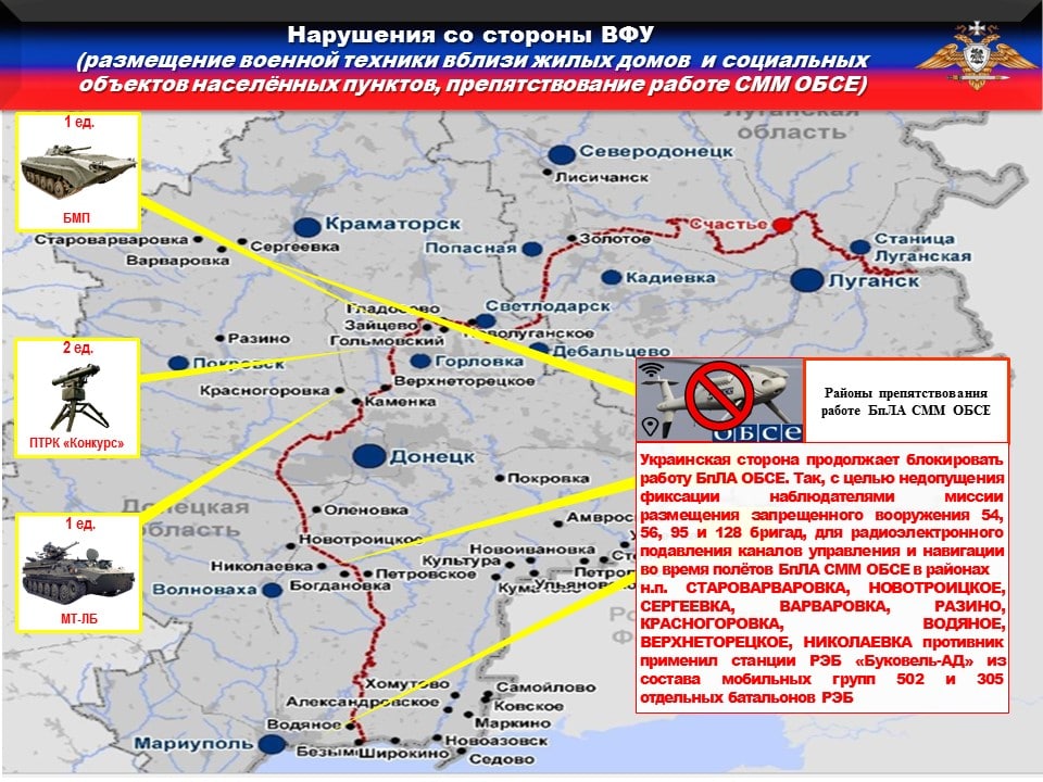⚠️Украинская сторона продолжает блокировать работу БпЛА ОБСЕ. Так, с целью недопущения фиксации наблюдателями миссии размещения запрещенного вооружения 54, 56, 95 и 128 бригад, для радиоэлектронного подавления каналов управления и навигации во время полётов БпЛА СММ ОБСЕ в районах