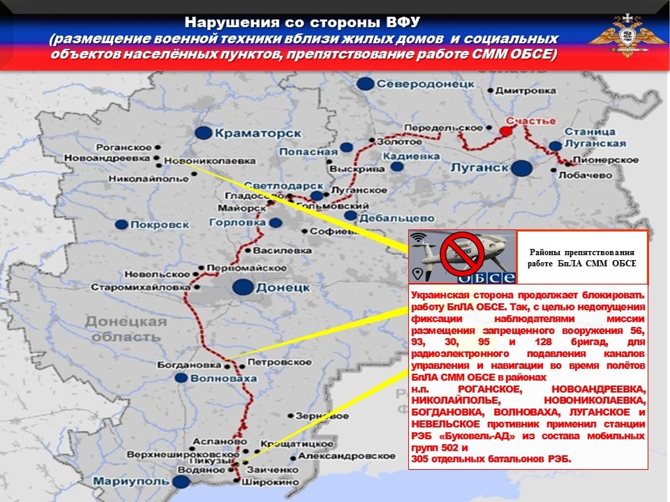 🚫Украинская сторона продолжает блокировать работу БпЛА ОБСЕ. Так, с целью недопущения фиксации наблюдателями миссии размещения запрещенного вооружения 56, 93 и 95 бригад, для радиоэлектронного подавления каналов управления и навигации во время полётов БпЛА СММ ОБСЕ в районах н.п. КОНСТАНТИНОВКА, БЕЛАЯ ГОРА, ВАРВАРОВКА, МИРНОЕ, ПРОХОРОВКА, СТАРОВАРВАРОВКА и НЕВЕЛЬСКОЕ противник применил станции РЭБ «Буковель-АД» из состава мобильных групп 502 и 305 отдельных батальонов РЭБ.