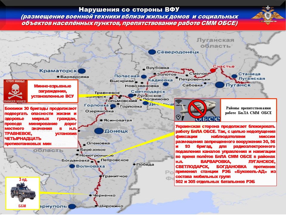 🔹Украинская сторона продолжает блокировать работу БпЛА ОБСЕ. Так, с целью недопущения фиксации наблюдателями миссии размещения запрещенного вооружения 95 и 93 бригад, для радиоэлектронного подавления каналов управления и навигации во время полётов БпЛА СММ ОБСЕ в районах н.п. ЛЕНИНСКОЕ и МИРНОЕ противник применил станции РЭБ «Буковель-АД» из состава мобильных групп 502 и 305 отдельных батальонов РЭБ.