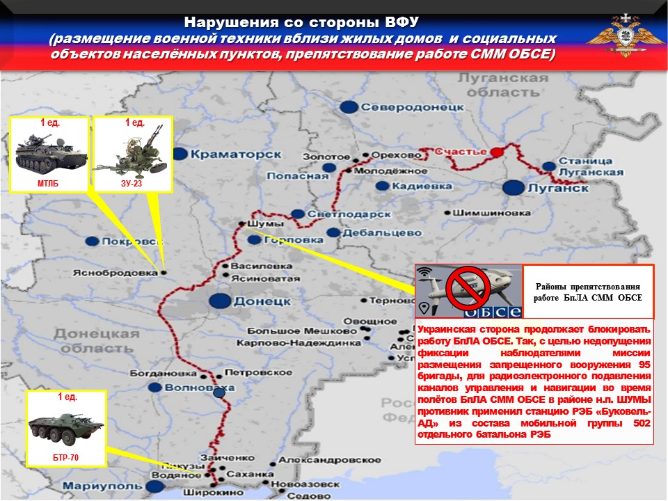 ⚠️Украинская сторона продолжает блокировать работу БпЛА ОБСЕ. Так, с целью недопущения фиксации наблюдателями миссии размещения запрещенного вооружения 95 и 128 бригад, для радиоэлектронного подавления каналов управления и навигации во время полётов БпЛА СММ ОБСЕ в районе н.п. АНДРЕЕВКА, БЕЛАЯ ГОРА, ПРИВОЛЬЕ и ШИРОКИНО противник применил станцию РЭБ «Буковель-АД» из состава мобильных групп 305 и 502 отдельных батальонов РЭБ.