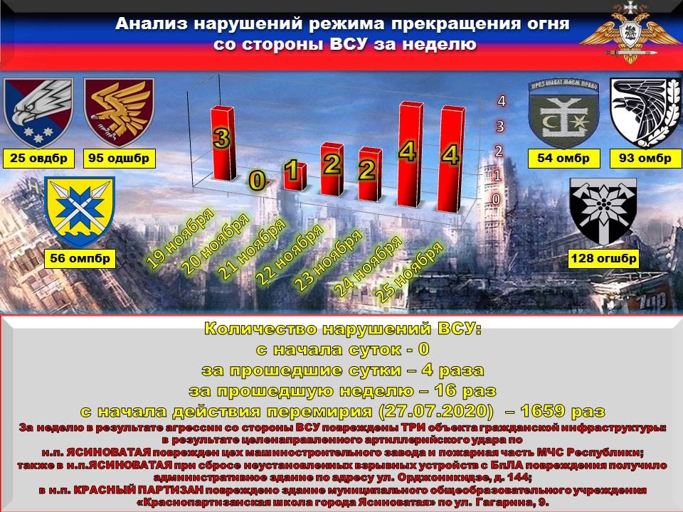 25 бригады по приказу военного преступника ЗЕНЧЕНКО обстреляли из 122-мм артиллерии город ЯСИНОВАТАЯ, где был поврежден цех машиностроительного завода и пожарная часть МЧС Республики.