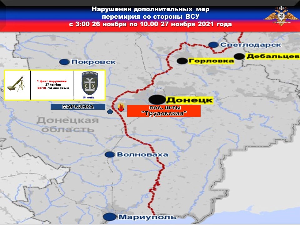 ❗️Противник продолжает огневые провокации, которые могут спровоцировать гуманитарную катастрофу, осуществляя обстрелы вблизи и в направлении объектов жизнеобеспечения. Согласно отчету от 29 ноября 2021 года, наблюдателями миссии вновь зафиксирован факт открытия огня с позиций 25 овдбр в районе ДФС.
