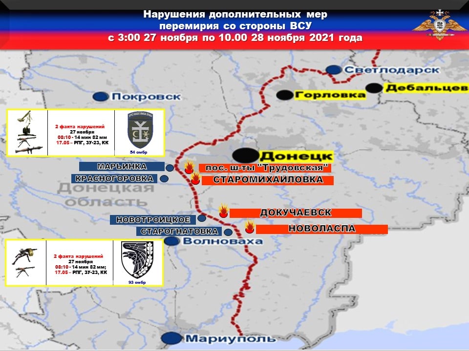 ❗️Противник продолжает огневые провокации, которые могут спровоцировать гуманитарную катастрофу, осуществляя обстрелы вблизи и в направлении объектов жизнеобеспечения. Согласно отчету от 29 ноября 2021 года, наблюдателями миссии вновь зафиксирован факт открытия огня с позиций 25 овдбр в районе ДФС.